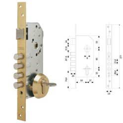 Cerradura Tesa Seguridad T2B354566LE, - Cilindro T60, - Escudo E300L, - Acabado esmaltado oro, - Bulones redondos de acero niqueladode Ø14 mm, en la caja principal, - Bulones planos de acero niquelado Ø14 mm, (ancho 10 mm,) en cajas auxiliares, - Mecanismos protegidos en cajas cerradas de acero galvanizado, - Puntos de cierre alto y bajo (acero carbonitrurado), - Cerradero alto de acero y cerradero de suelo con guardapolvos, - Frente de acero de perfil en U de elevada rigidez, idóneo para puertas RF, - Mecanismo en los reenvíos con sistema anti-retorno, - Cerraderos largos de ancho estándar de 45 mm, - Altura estándar de 2,028 mm, y opcional para alturas de 2,035 mm,