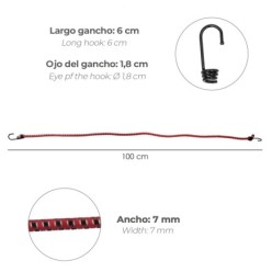 Pulpo De Goma Con Ganchos - Longitud: 1,5 metros, - Ancho: 7 mm, - Longitud / ojo del gancho: 6 cm x Ø 1,8 cm, - Capacidad de amarre: 70 N, Cumple con la normativa europea EN12195-2, - Nucleo fabricado en latex 100%, con revestimiento de hilo de polipropileno para aportar una mayor resistencia a la rotura, - Ganchos realizados en metal, - Indicado para tareas domesticas como transporte de mercancias ligeras, equipajes, fijar toldos, lonas, uso en camping, jardineria, etc, - No utilizar para levantar o asegurar cargas, - Articulo conocido como pulpo elastico, gomas elasticas, cuerda elastica, tensores elasticos, correa de sujecion,